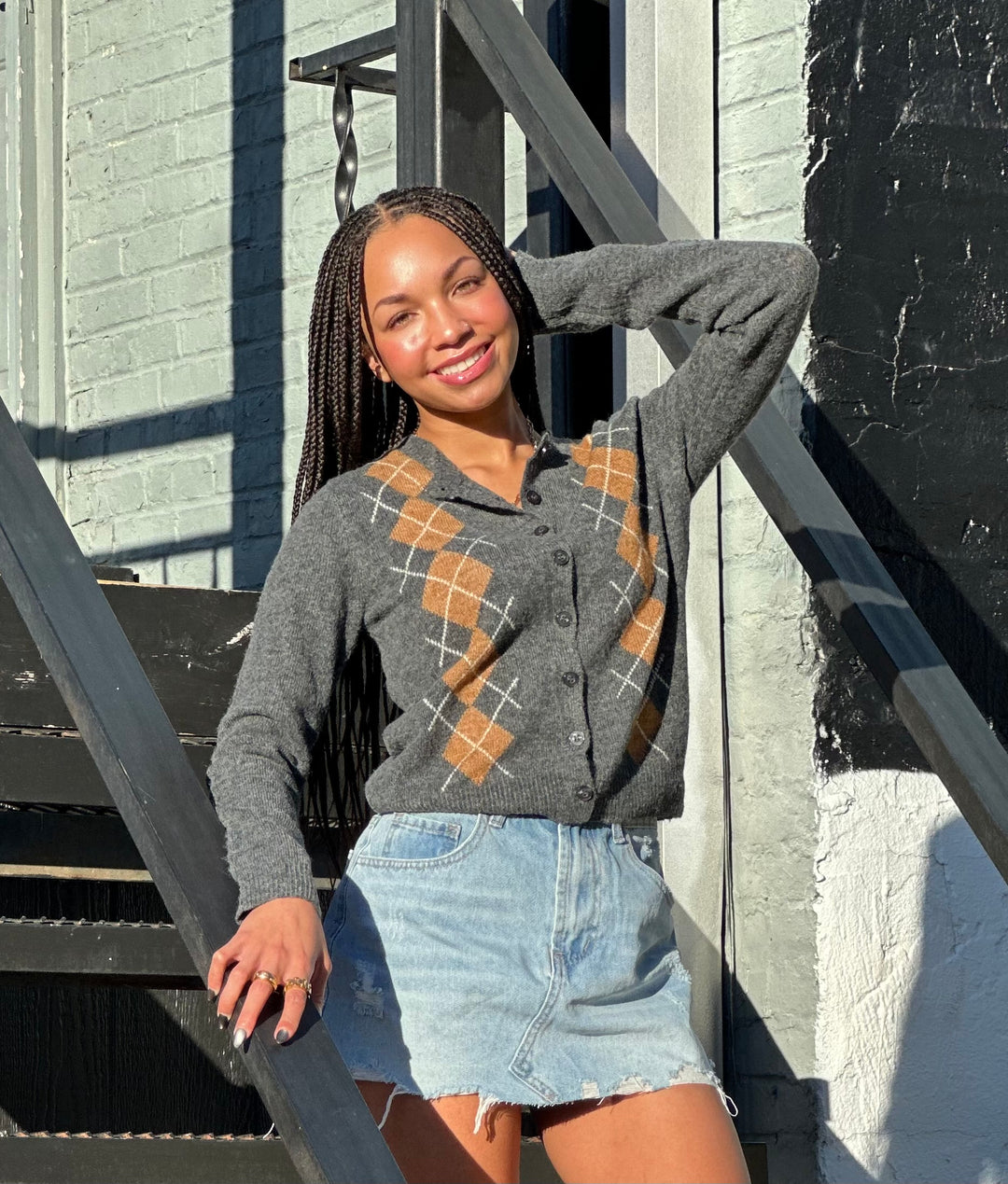Checkered Drop Shoulder Buttoned V Neck Cardigan