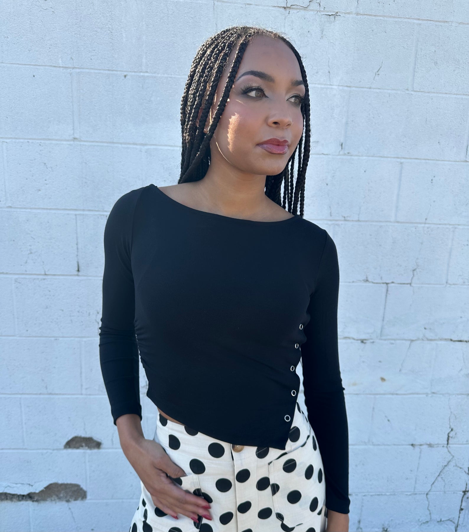 Black long sleeve crop top with asymmetrical snap buttons with stretch